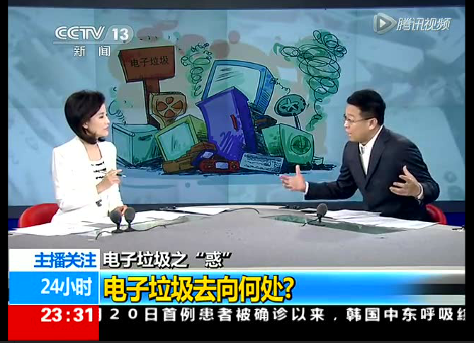 2015年6月21日,中央電視臺新聞頻道播出“電子垃圾去向何處”的采訪報(bào)道,就電子垃圾的現(xiàn)狀危害及正確的處理方式,華新環(huán)??偨?jīng)理王建明及子公司香蕉皮副總經(jīng)理肖賢飛等,接受了采訪。